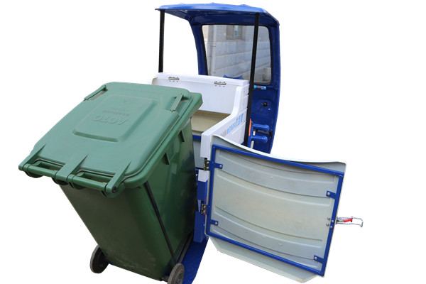 平板頭240L掛桶車,后門板直接放下,垃圾桶可推上或推下